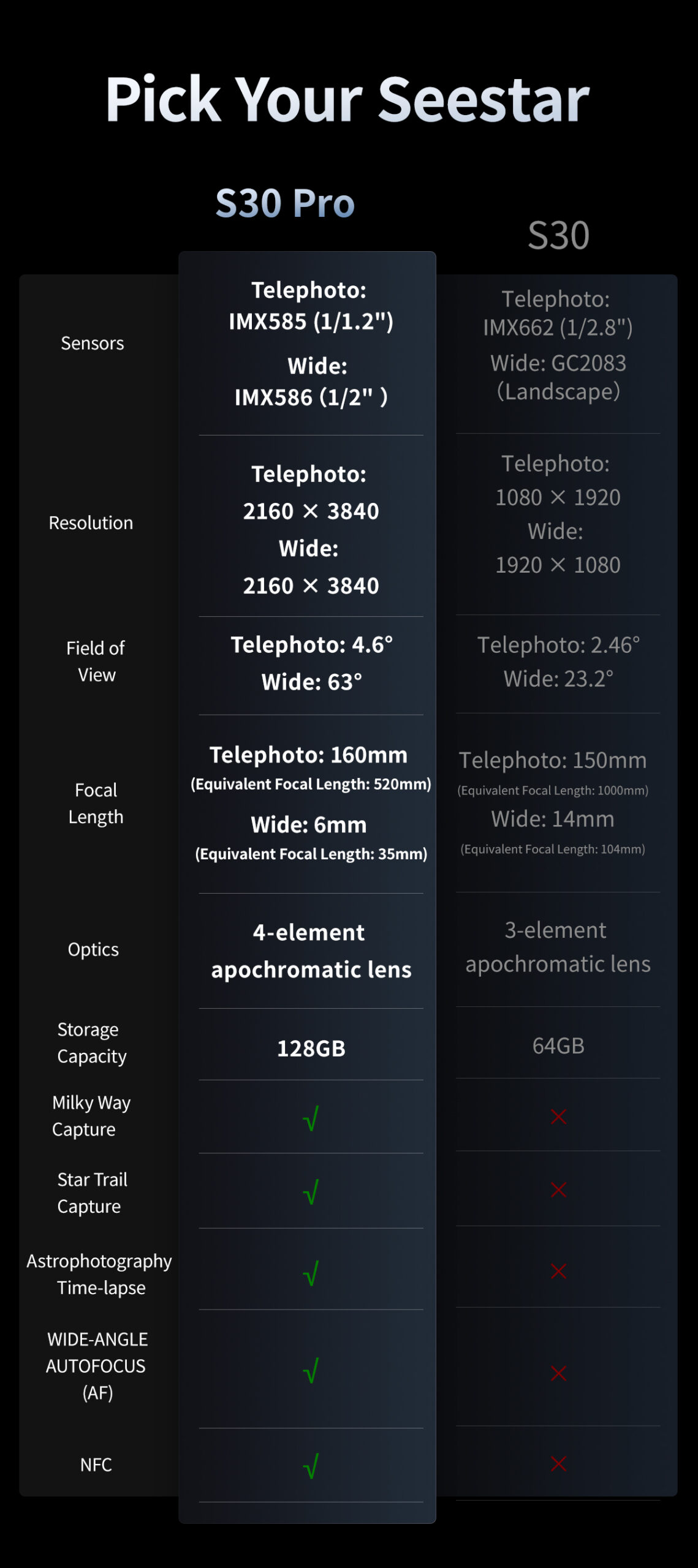 A dual-lens system with 4K wide-angle and telephoto cameras, elevating smart telescope imaging to a professional level. Powered by a telephoto IMX585 sensor (1/1.2″, 4× larger light-sensitive area vs. S30) and a wide-angle IMX586, it delivers 4× higher resolution, lower noise, and cleaner, more natural image quality.